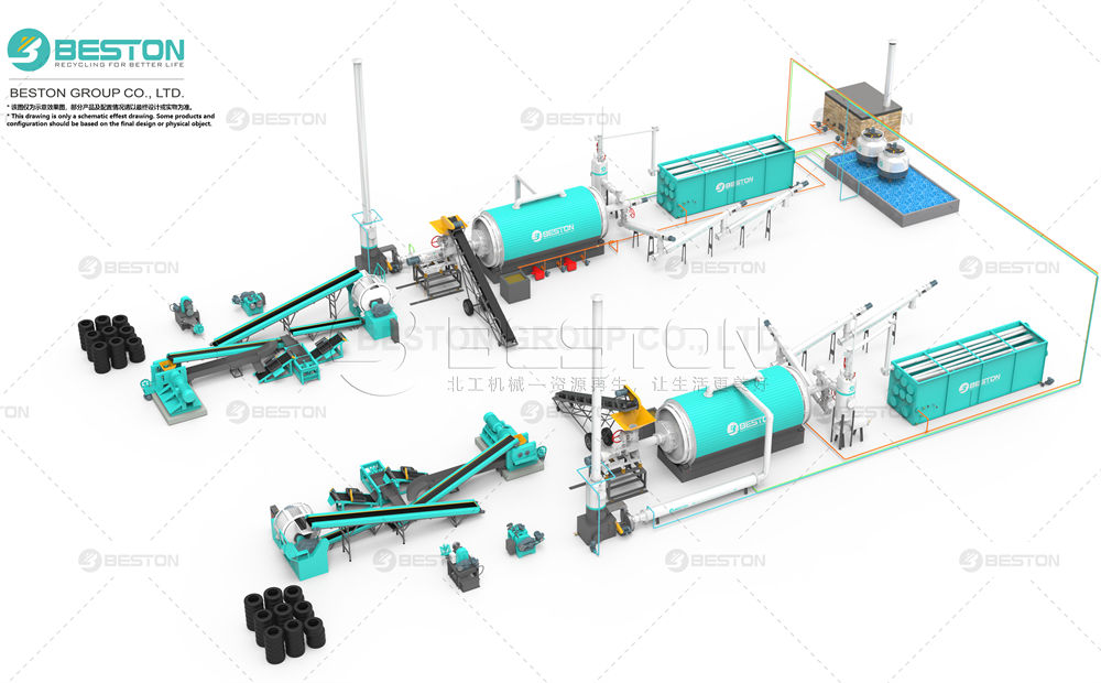 比如我們這個間歇式工藝的BLJ-16型号,日處理15噸左右的輪胎,給客戶設計的方案就好幾個。有的是普通上料方式,有的是液壓上料方式,有的是螺旋進料方式,有的還需要二拖一結構,有的需要預處理設備,還有需要搭配輪胎油蒸餾設備等。